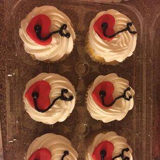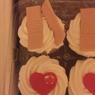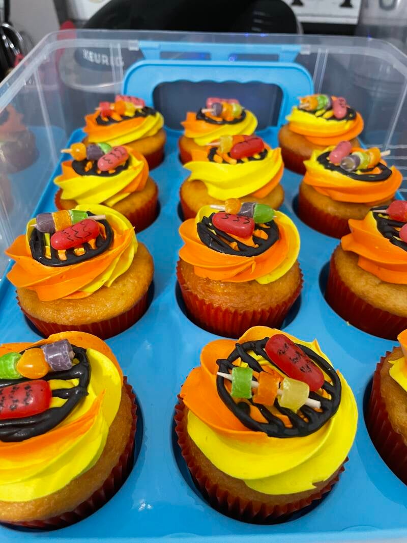 Vanilla Cupcake with Brownie 'hamburger' and Vanilla Frosting 'condiments'